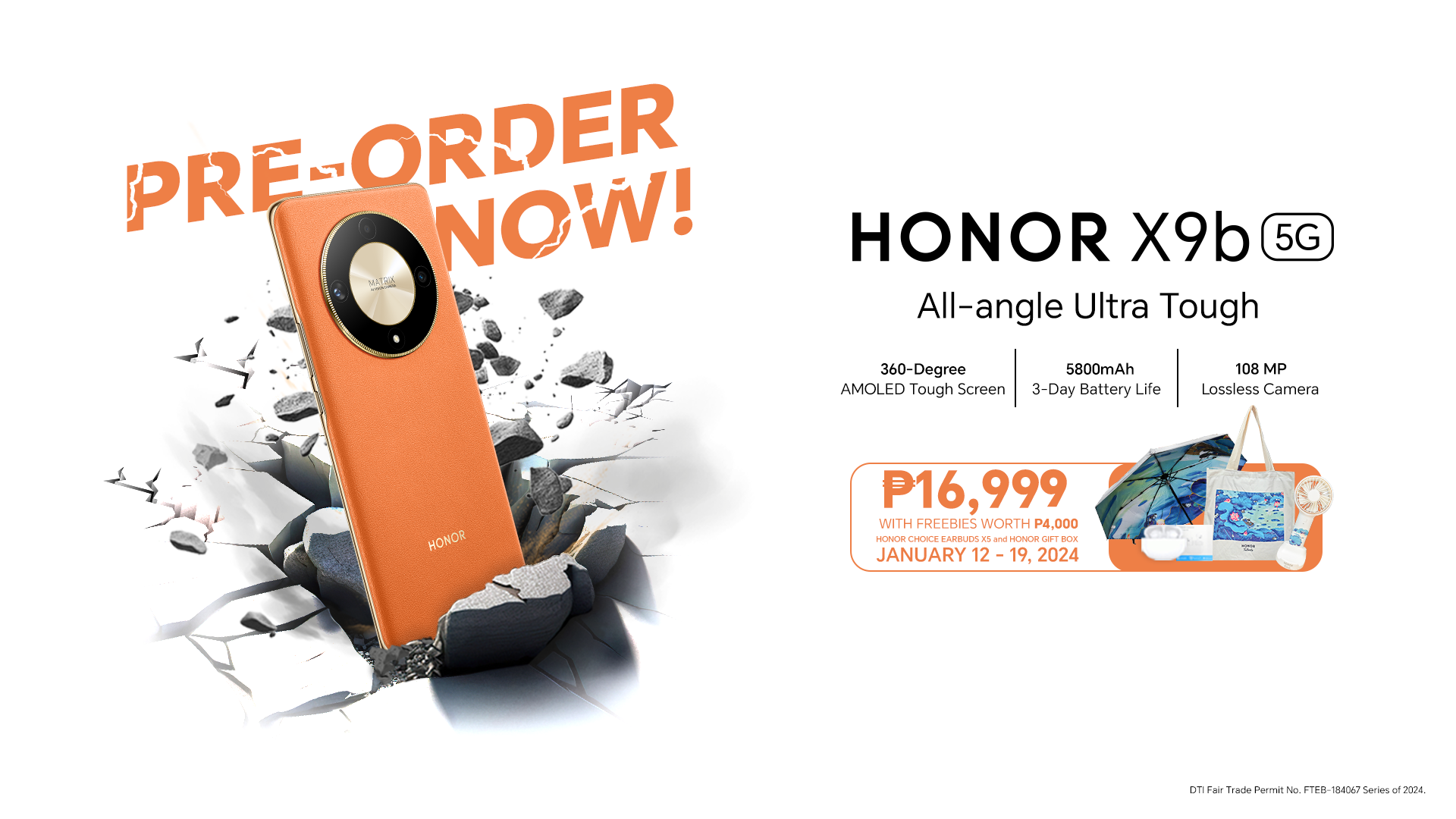 Customers who will pre-order the HONOR X9b 5G until January 19, 2024 can get a free HONOR Gift Box and HONOR Choice X5 Earbuds worth P4,000.