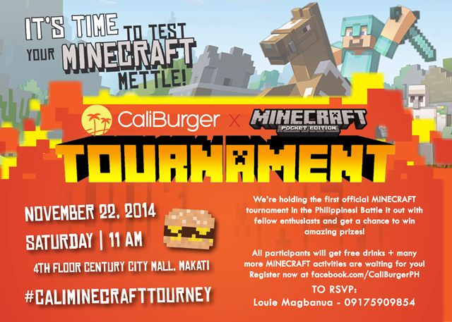CALIBURGER is hosting the first official MINECRAFT Tournament in the Philippines. They are inviting everybody who enjoys playing MINECRAFT this November 22, 2014, Saturday, 11:00AM at the CaliBurger Makati Branch located at the 4th Floor of Century City Mall, Kalayaan Avenue, Makati City (near A.Venue).