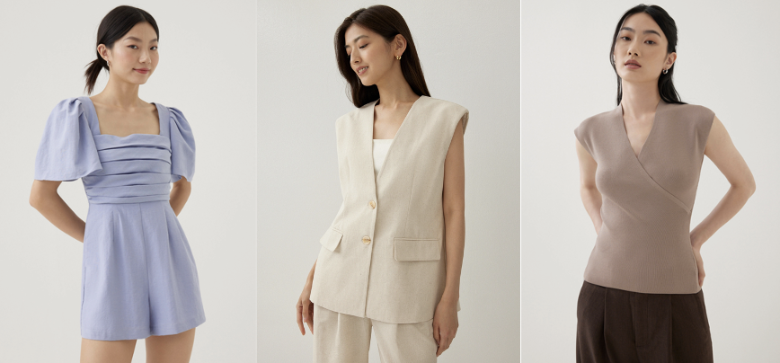 From left to right: Jia Pleated Flare Sleeve Romper in Periwinkle, Zilla Shoulder Padded Linen Vest in Beige, Debbie Knit V-Neck Wrap Top in Taupe