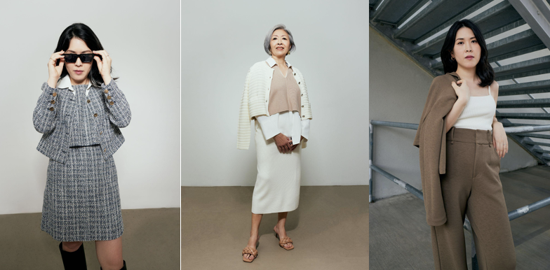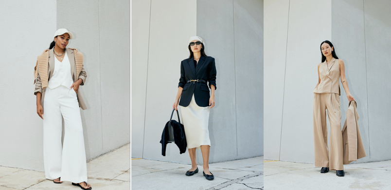 From Left to Right: RuchedReady™ Rachel Blazer (Clay), Kiara Crop Shoulder Padded Knit Cardigan (Tan), Yuna Relaxed V-neck Vest (White), Leggy™ Yuna Super High Waist Tailored Pants (White); RuchedReady™ Rachel Blazer (Black), Yui Fitted Long Knit Vest (Black), Midaxi Satin Bias Skirt (Cream); RuchedReady™ Aera Slim Blazer (Tan), Juni Sleeveless Blazer Top (Tan), Leggy™ Mayumi Elastic Pleated Wide Leg Pants (Tan)