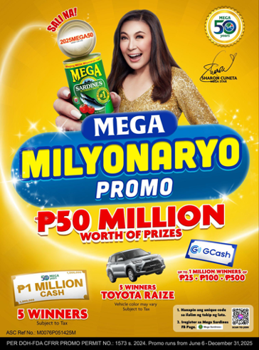 This promo is valid from June 6 to December 31, 2025 with ASC Ref No.: M0076P051425M and DOH-FDA CFRRR Promo Permit No.: 1573 s. 2024. For more information on the Mega Milyonaryo promo, you may check out Mega Sardines social media pages.###